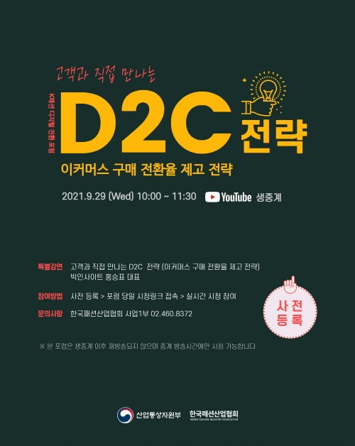 이번 포럼은 오는 9월 29일 유튜브 생중계를 통해 빅인사이트 홍승표 대표의 ‘고객과 직접 만나는 D2C 전략’을 주제로 한다. 주제 발표와 전문가 패널 토론을 통해 이커머스 구매 전환율 제고 등에 대해 논의한다.