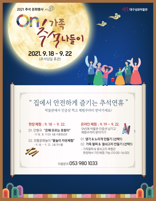 대구섬유박물관이 한가위를 맞아 9월 18일부터 22일까지 추석 문화행사 ON가족 추석 나들이로 다양한 프로그램을 마련한다.