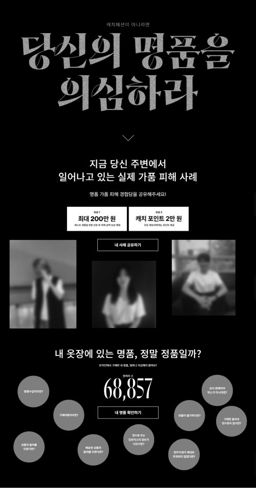 또한 주변에서 접할 수 있는 가품 피해 사례를 공유하며 소비자들의 가품 구매 경험을 공모하는 이벤트도 진행 중이다. 사연 응모에 참여하는 전원에게는 캐치패션에서 사용 가능한 캐치 포인트 2만원권을 증정한다. 특히 응모된 사연 중 총 8명을 선정하여 가품 피해금 최대 200만원 상당을 캐치패션에서 대신 보상해준다. 가품 구매 사례 응모는 캐치 페이크 닷컴 내 내 사례 공유하기를 통해 참여할 수 있다.