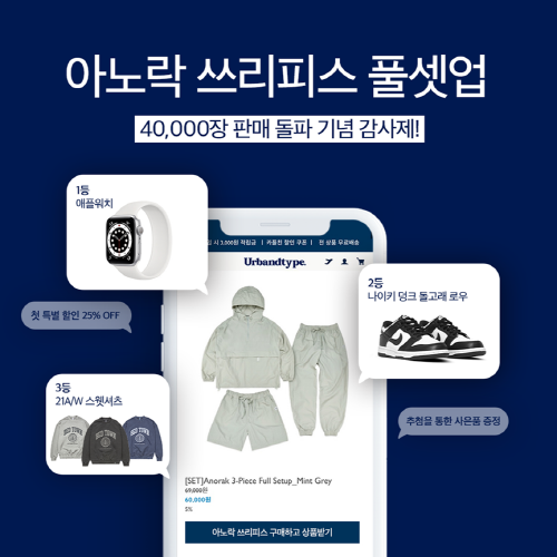 ‘어반디타입’은 이번 4만장 판매 돌파 기념으로 아노락 쓰리피스 셋업 감사제를 연다. 9월 24일부터 10월 7일까지 25% 할인된 가격에 판매하며 감사제 기간 내 아노락 쓰리피스 풀셋업 구매 고객 대상으로 추첨을 통해 사은품을 증정한다.