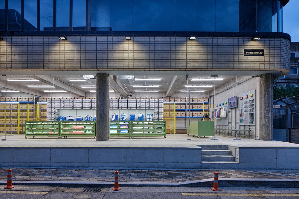 ‘프라이탁’ 홍대 스토어는 시각적인 컨셉이 주가 되는 기존 방식의 틀을 깨고 기능적이고 효율 중심적인 매장을 컨셉으로 기획했다. 창고가 결합되어 있는 형태로 제품 입고 과정부터 소비자의 손길이 닿는 그 순간까지의 과정을 여과 없이 볼 수 있다. 이러한 매장의 형태는 개방적이고 투명하며 특유의 산업적인 분위기를 자아낸다.