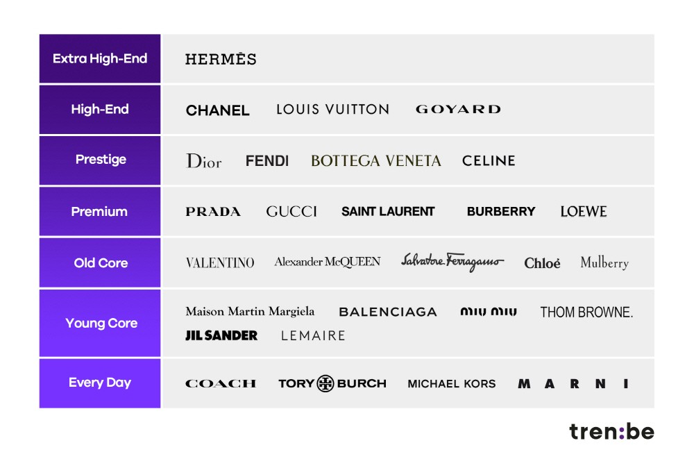다음으로 올드코어와 영코어 레벨이 있는데 올드코어는 전통적인 대표 디자인을 가진 브랜드들로 구성했다. 락스터드 장식의 ‘발렌티노’, 원형과 곡선 디자인을 내세운 ‘끌로에’, 밝고 경쾌한 색감이 상징적인 ‘미우미우’ 등이 꼽힌다. 반면 영코어는 젊은 감성을 대변하는 컨템퍼러리 브랜드들로 실험적인 디자인을 지속 선보이는 ‘발렌시아가’와 미니멀리즘의 대표 아이콘인 ‘르메르’, 그리고 8~10월 판매 순위 7위를 차지한 ‘메종마르지엘라’ 등이 있다.