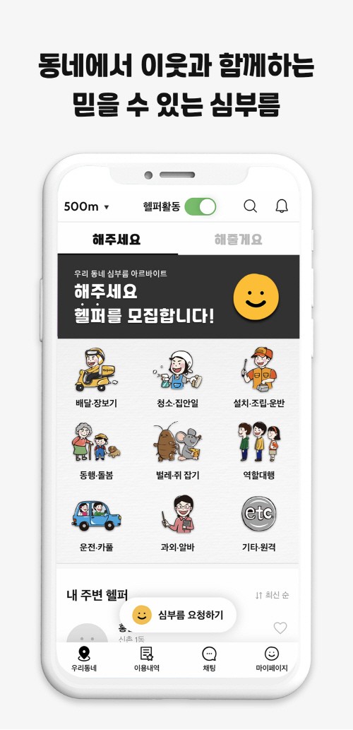 해주세요에서는 사용자 인근을 중심으로 주변 헬퍼들에게 원하는 심부름을 요청할 수 있다. 또 헬퍼 등록을 통해 이웃 심부름을 수행해주고 비용을 받을 수도 있다.