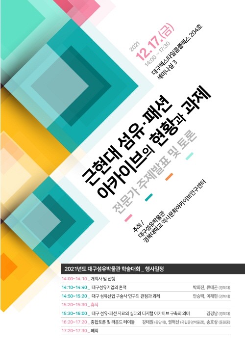 대구섬유박물관이 경북대학교 역사문화아카이브연구센터와 함께 오는 12월 17일 ‘대구 섬유패션 아카이브의 현황과 과제’ 학술세미나를 개최한다.