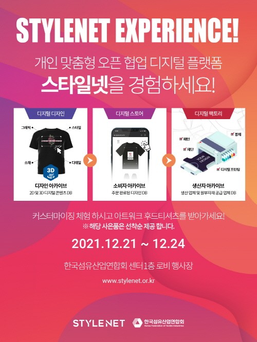 한국섬유산업연합회(회장 이상운)가 스타일넷 오프라인 체험행사 STYLENET EXPERIENCE를 오는 12월 21일부터 24일까지 섬유센터 1층에서 진행한다.