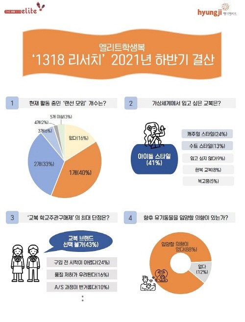 또한 ‘엘리트학생복’은 올해로 시행 7년차에 접어든 ‘교복 학교주관구매제’ 관련 설문을 통해 청소년들의 목소리에 귀를 기울였다. 설문 참여 학생의 94%가 ‘입학 당시 학교주관구매제를 통해 교복을 구입했다’고 답했으며 이 제도를 통해 구입한 교복에 만족한다고 답한 비중은 전체의 67%였다. 청소년들은 ‘교복 학교주관구매제’의 가장 큰 단점으로 ‘원하는 교복 브랜드를 선택할 수 없는 것(43%)’을 꼽았으며 ‘구매 전 미리 입어보기 힘든 것(24%)’, ‘가격 경쟁으로 인해 교복 품질이 낮아지는 것(16%)‘ 등에 대한 아쉬움을 표했다.