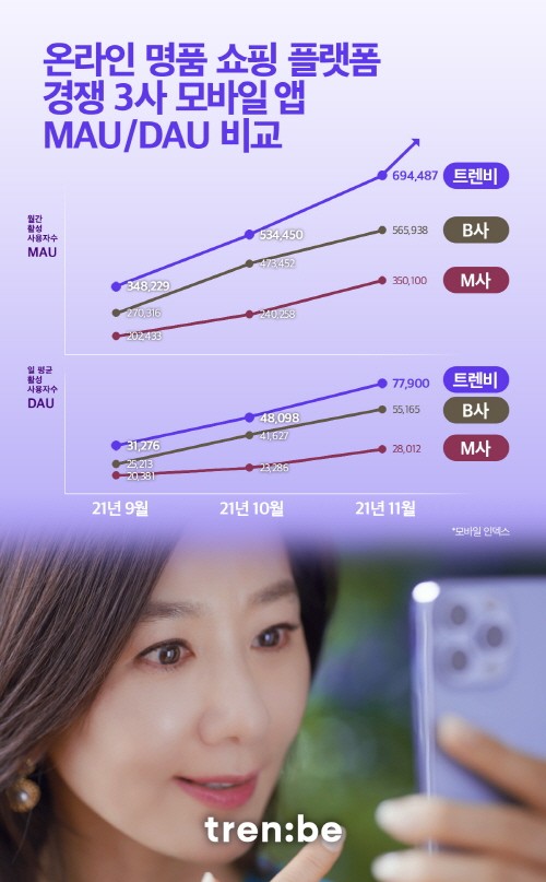 트렌비는 최근 온라인 명품 쇼핑 플랫폼 경쟁이 심화되며 TV광고 및 브랜드 캠페인을 시작한 지난 9월부터 11월까지 3개월간 DMP 기반 앱 분석 서비스 모바일 인덱스가 모바일 앱 사용자수 추이를 분석한 결과 월간 활성 사용자수와 일간 활성 사용자수가 경쟁사에 비해 높게 나타났다고 밝혔다.