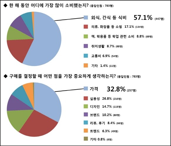 ‘2021년 한 해 동안 어디에 가장 많이 소비했는지’에 대한 질문에 학생들은 ▲외식, 간식 등 식비(57.1%, 447명), ▲의류, 화장품 등 쇼핑(17.1%, 134명), ▲책, 학용품 등 학업 관련 소비(8.8%, 69명), ▲취미생활(8.7%, 68명), ▲교통비(6.9%, 54명), ▲기타(1.4%, 11명)라고 응답했다.