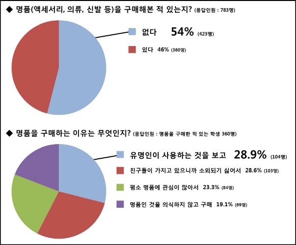 명품을 구매한 적이 있는 학생들을 대상으로 한 ‘명품을 구매하는 이유는 무엇인지’에 대한 질문에는 ▲유명인(연예인, 인플루언서 등)이 사용하는 것을 보고 예뻐서(28.9%, 104명), ▲친구들이 가지고 있으니까 소외되기 싫어서(28.6%, 103명), ▲평소 명품에 관심이 많아서(23.3%, 84명), ▲명품인 것을 의식하지 않고 구매(19.1%, 69명) 라고 응답했다.