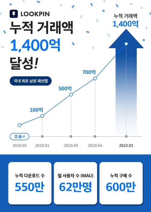 남성 패션 앱 룩핀이 누적 거래액 1400억원, 누적 다운로드 수 550만회를 달성했다.