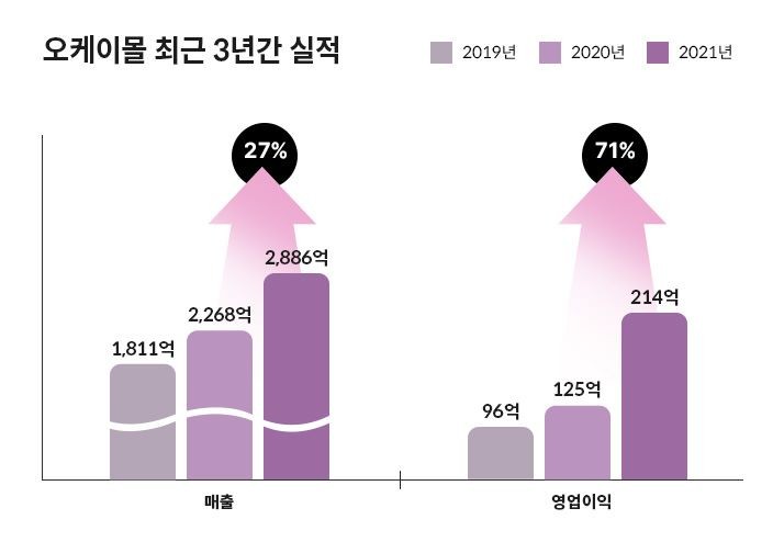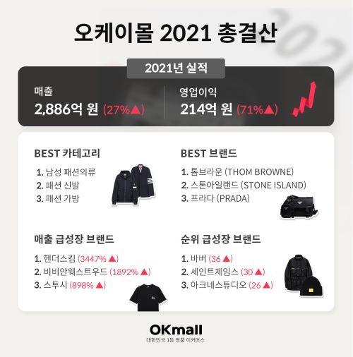 오케이몰은 지난 2021년 매출 2886억원, 영업이익 214억원을 기록, 역대 최고 실적을 기록했다고 밝혔다. 이는 전년 대비 매출은 27%, 영업 이익은 71% 증가한 수치다.