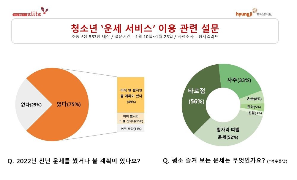 형지엘리트(대표 최병오)가 운세 서비스에 관한 청소년들의 인식과 경험을 파악하고자 온라인 설문조사를 실시했다. 조사 결과, 청소년 4명 중 3명은 ‘2022년 신년 운세를 이미 봤거나 볼 계획이 있다(75%)’고 응답해 Z세대 사이에서도 운세 서비스에 대한 수요가 높은 것으로 확인됐다.