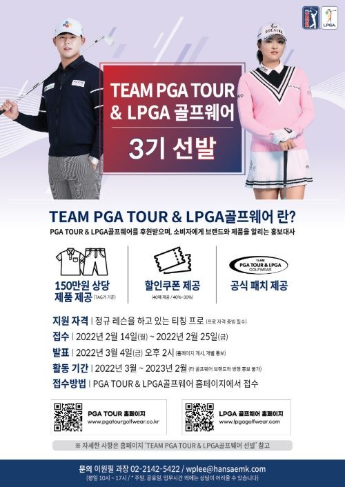 한세엠케이(대표 김동녕 김지원)가 ‘PGA TOUR’ & ‘LPGA’ 공식 서포터즈인 ‘TEAM PGA TOUR &LPGA 골프웨어’ 3기를 모집한다.