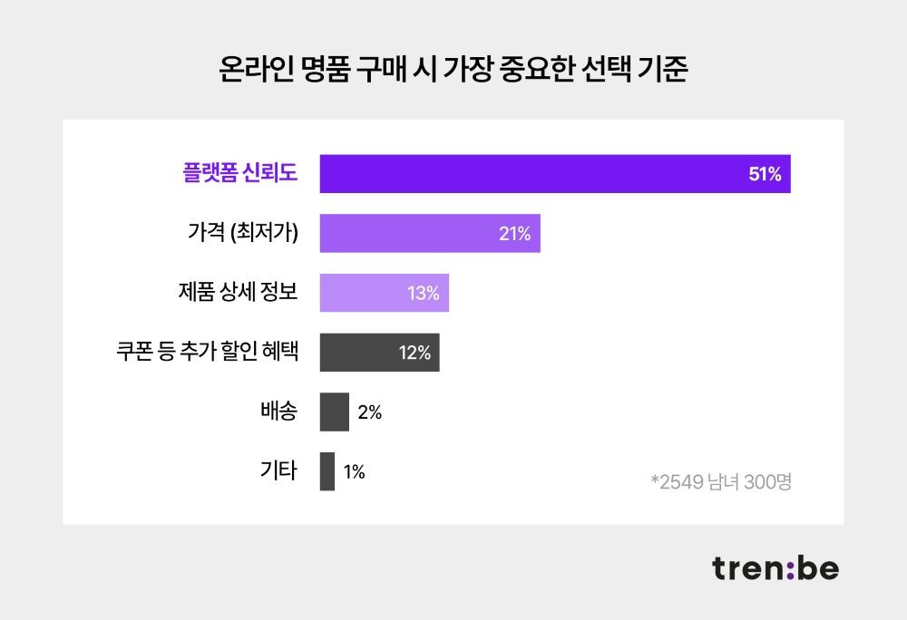명품 플랫폼 트렌비가 2549세 남녀 소비자 300명을 대상으로 명품 구매 행태를 조사했는데 상품의 정가품 신뢰도를 포함해 플랫폼의 UX/UI, 브랜드 디자인, 구매 프로세스, 비즈니스 구조 등이 영향을 미친다고 응답자의 51%가 답했다.