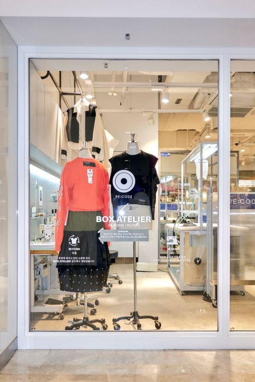 코오롱인더스트리 FnC부문이 업사이클링 브랜드 ‘래코드’의 수선 리폼 서비스 ‘박스 아뜰리에’를 19일 스타필드 코엑스에 오픈했다.