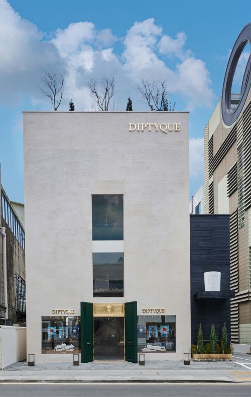먼저 웅장하면서도 세련된 절제미를 느낄 수 있는 파사드는 파리 오스만 건축 양식을 차용했으며 건물 크기에 걸맞게 특수 제작된 4미터 높이의 거대한 정문 또한 전통 양식의 디테일을 가미했다. 건물 옆은 강렬한 블랙 목재 판넬과 대형 향초 오브제로 장식해 크림색의 외관과 대조되는 자연스러운 색조를 완성시켰으며 문턱에는 현지에서 제작된 ‘diptyque 서울’ 모자이크 패턴 카펫을 새겨 넣었다.