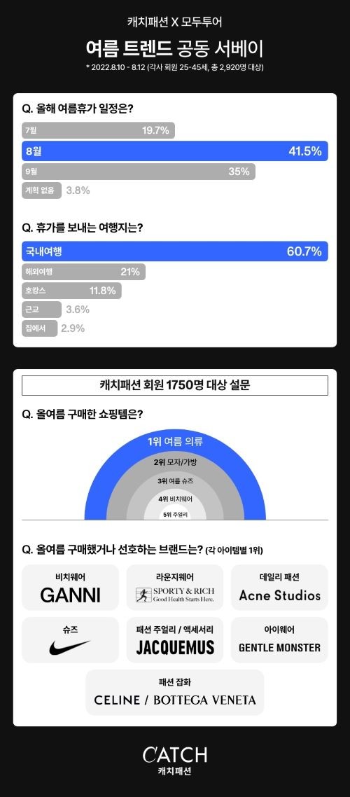 캐치패션(대표 이우창)이 지난 8월 10일부터 12일까지 국내 최대 여행 포털사이트 모두투어와 함께 각 사 회원을 포함한 25세부터 45세까지 총 2920명을 대상으로 여름휴가 트렌드 설문조사를 실시했는데 휴가 일정을 묻는 질문에 10명 중 6명이 7월(19.7%)과 8월(41.5%)이라고 답했는데 9월 이후로 계획했다는 이들도 35%로 높게 조사됐다. 코로나 재확산, 이른 추석 연휴 등이 영향을 미친 것으로 보인다. 또 휴가계획이 없다(3.8%)는 응답자도 있었다.