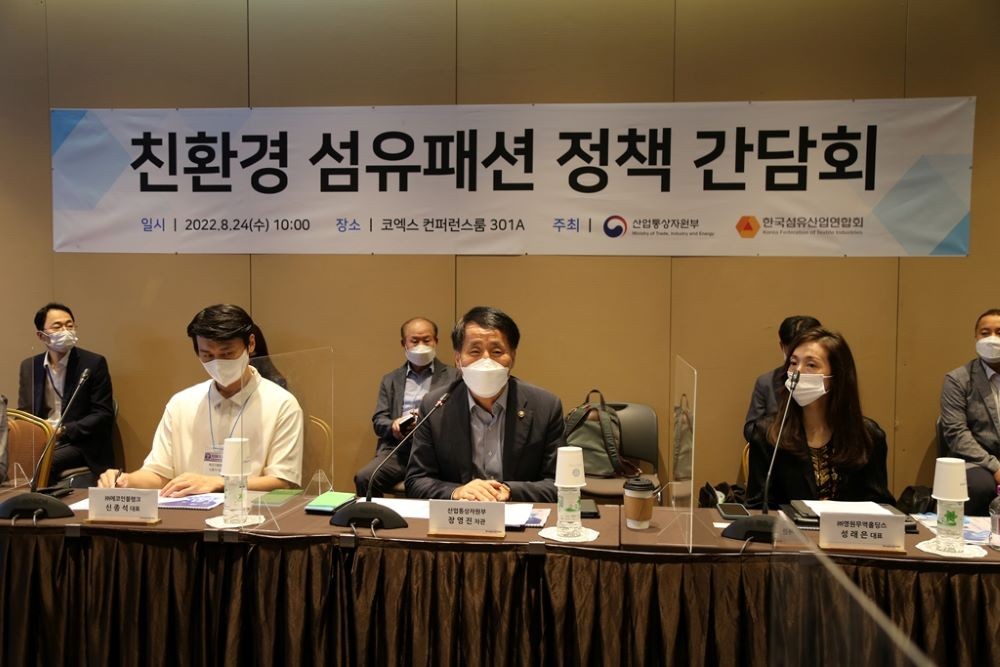 장영진 산업통상자원부 1차관이 오늘(24일) 오전 코엑스에서 주요 섬유패션기업 대표들과 함께 정책 간담회를 갖고 섬유패션산업의 친환경 및 저탄소화 방안을 논의했다.