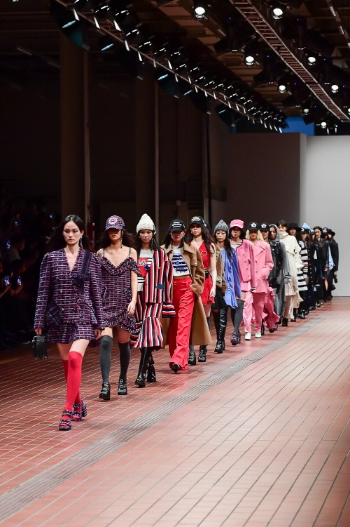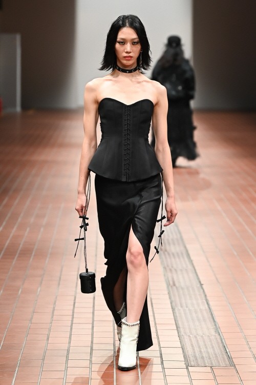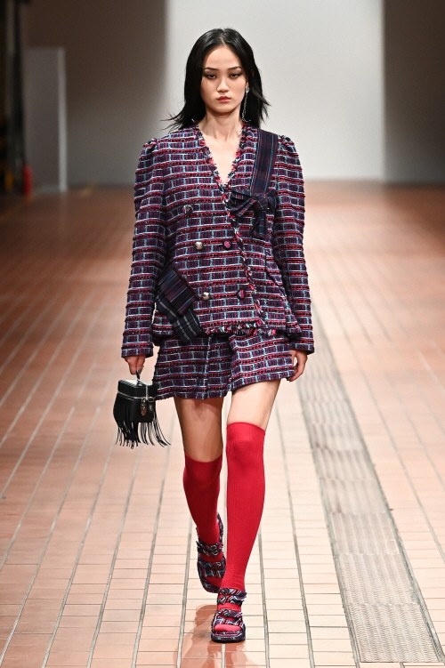 또한 롱 스커트, 레이어드 원피스를 비롯해 네오프렌 및 프린트 패치워크 소재의 아이템을 통해 ‘럭키슈에뜨’가 추구하는 세련된 실루엣과 풍부한 장식, 스포티 스타일을 재해석해 주목을 받았다. 독보적인 제화 브랜드 ‘슈콤마보니와 협업으로 완성된 슈즈는 반항적인 실루엣의 부츠와 여성스러운 장식이 더해져 쇼를 한층 빛나게 했다.