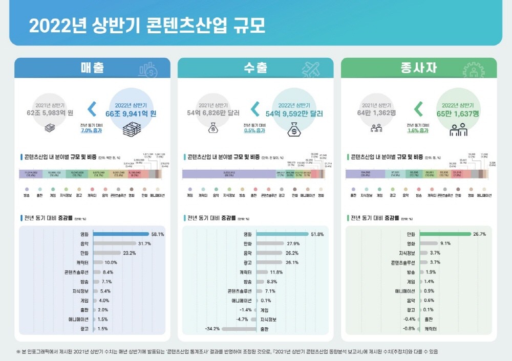 2022년 상반기 국내 콘텐츠산업 매출액은 전년 동기 대비 7.0% 증가한 약 66조9천억원으로 파악됐다. 코로나19 영향으로부터 회복하는 추세가 이어지며 ▲영화(58.1%)가 가장 높은 성장률을 기록했다. 다음으로 ▲음악(31.7%) ▲만화(23.2%) 산업이 매출 상승세를 이어갔다.