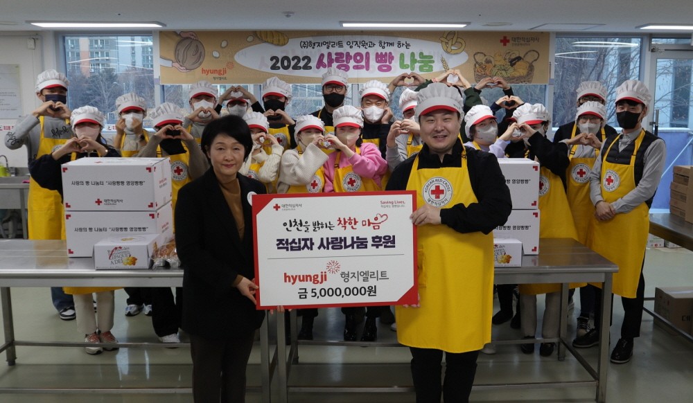 형지엘리트(대표 최병오)가 지난 19일 대한적십자사 인천지사를 방문해 사랑의 빵 나눔 봉사활동을 진행했다.