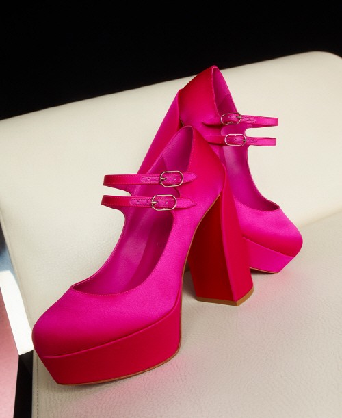 이번 컬렉션에는 브랜드의 베스트 셀러인 메리 제인을 기반으로, 파티 시즌에 딱 맞는 고급스러운 블랙과 버건디 벨벳, 핫핑크 사틴으로 재해석된 플랫폼 샌들과 블록 힐 샌들이 포함되어 있다.