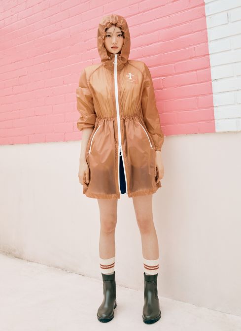 ‘빈폴레이디스’는 비 올 때 입으면 좋을 아우터로 캐주얼한 감성의 사파리 점퍼를 추천했다. 오렌지 컬러와 은은한 광택이 돋보이는 후드 점퍼에 화이트 컬러의 방수 지퍼로 포인트를 더했으며, 후드와 밑단 부분의 스트링을 조절해 다양한 실루엣을 연출할 수 있다. 또 네이비 컬러에 경쾌한 무드의 레터링 그래픽이 적용된 롱 사파리 점퍼도 내놨다. 두 제품 모두 생활 방수가 가능해 더욱 실용적이다.