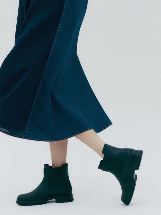 ‘구호’는 브랜드 특유의 미니멀한 무드를 바탕으로 한 첼시 레인부츠를 선보였다. 둥근 형태의 앞 코가 매력적이며 차분한 블랙 컬러로 캐주얼하면서도 깔끔하다. 통이 넉넉해 장마철에는 바지를 넣어 입을 수 있어 유용하고, 출시 이후 리오더를 진행했을 정도로 반응이 좋다.