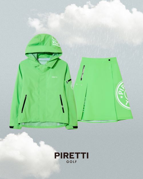 ‘피레티’ 레인웨어는 가볍고 부드러운 터치감의 방수 방풍 소재로 궂은 날씨에도 끄떡없는 라운드가 가능하다. 레인자켓과 레인스커트로 구성돼 세트로 입을 수 있고 고급스러운 디자인과 소재로 필드뿐 아니라 일상에서 바람막이 자켓으로도 활용 가능하다.