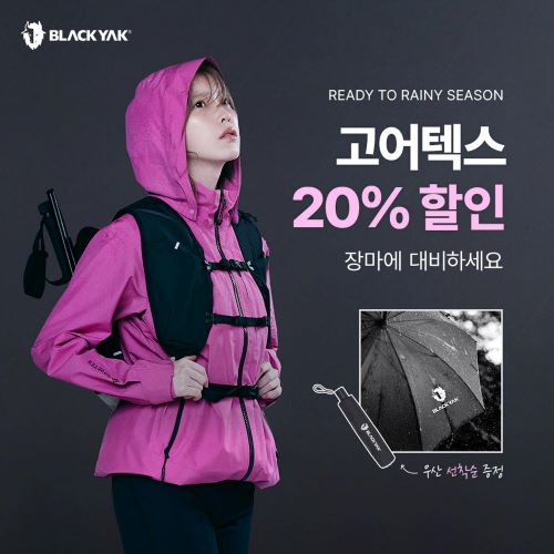 블랙야크는 갑작스럽게 내리는 장맛비에 대비할 수 있는 방수 의류와 신발, 용품 등을 최대 20% 할인된 가격에 선보이는 레인 프로모션을 14일까지 진행한다. 브랜드 모델 아이유와 손석구가 화보서 우중 산행 컨셉으로 착용한 다나스 GTX 자켓노카엔 GTX 3L 자켓도 포함됐다. 여기에 결제 금액 기준 15만원 이상 구매한 고객에게는 국내에서 수거한 폐페트병을 재활용해 만든 우산을 랜덤으로 선착순 증정하고 있다.