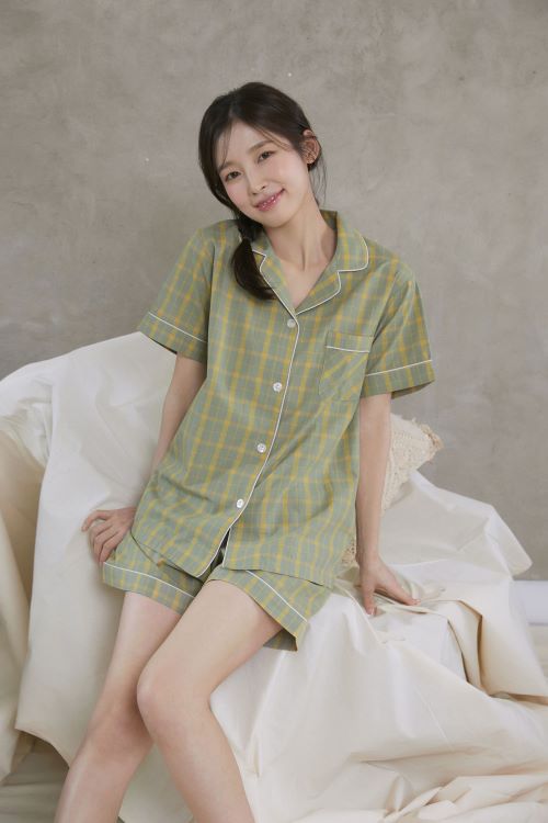 라이트 그린 컬러 바탕에 옐로우 체크패턴으로 편안함을 강조한 홈캉스 패션을 연출할 수 있다. 상의 넥 라인은 화이트 파이핑 라운드 카라로 깔끔하고 상의 주머니로 편리하고 실용적이다. 하의는 부드럽고 신축성 좋은 밴딩과 편안하고 경쾌한 슬림핏 3부 기장으로 가볍고 시원하게 착용할 수 있다.