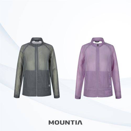 ‘마운티아’의 자켓 2종은 얇고 가벼워 한여름에도 쾌적한 착용감을 선사한다. 먼저 남성용 자켓 ‘마일자켓’은 초경량 나일론 소재를 사용해 무척 가벼우면서도 별도 파우치 없이 포켓을 사용해 작게 접어 휴대할 수 있어 날씨와 필요에 따라 입고 벗기 좋다. 일체형 후드와 군더더기 없는 스포티한 디자인으로 가벼운 러닝과 트레킹 등에 입기 좋다. 쿨그레이, 올리브, 라이트블루가 있다.