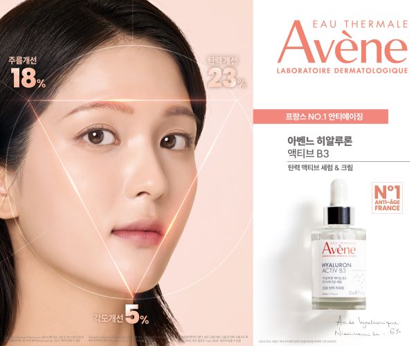 ‘아벤느’ 히알루론 액티브 B3 안티에이징 세럼 & 크림은 프리미엄 탄력케어 제품으로 탄력과 주름의 집중 케어가 가능하다. 특히 나이아신아마이드 6%와 이중 히알루론산, 아데노신의 트라이앵글 포뮬라로 콜라겐 부스팅과 히알루론산 강화 효과가 있으며 힘을 잃고 늘어지는 모공과 무너져가는 피부 라인을 개선하여 탄력 있는 피부의 역삼각형을 찾아주는 안티에이징 라인이다.