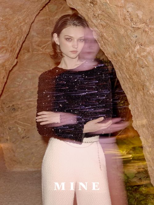 공개된 화보 속 조명을 받아 신비롭게 반짝이는 글리터 소재의 크롭 자켓은 마인의 이번 테마를 표현하고 있으며 숄 스카프와 벨트를 활용해 다양한 실루엣으로 연출이 가능한 캐시미어 코트와 팬시 울 소재의 가디건과 팬츠 셋업은 부드럽고 편안한 럭셔리한 룩을 제안한다.