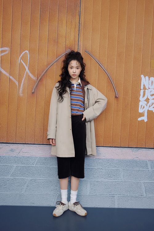 하프 기장의 트렌치 코트에 스트라이프 카라 티셔츠와 팬츠를 착용하거나 브라운과 그린이 레이어드된 카디건에 플레어 스커트를 착용해 가을 시즌 빠질 수 없는 코트 패션을 완성했다.