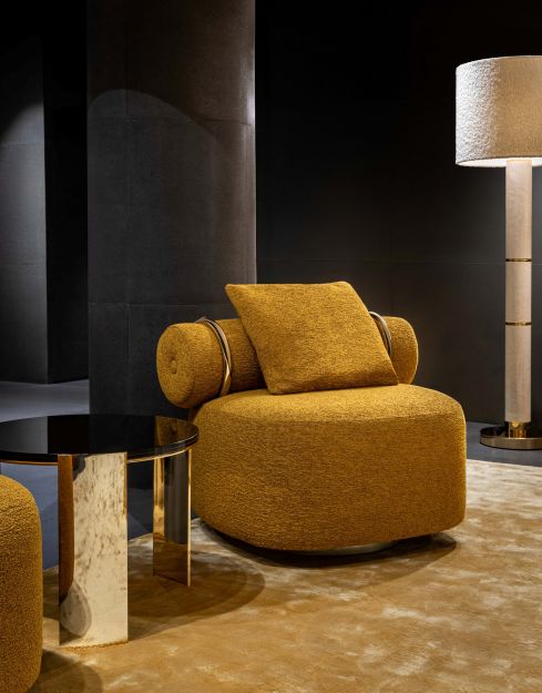 특히 편안함과 조형적 완성도를 정교하게 결합한 새로운 가르데니아 암체어를 선보였다. 풍성한 패딩이 부드러운 볼륨감을 형성하며 원통형 등받이가 이를 한층 강조한다. 또한 새로운 7종의 패브릭 컬러 중 하나인 알헤나 옐로 오커 부클레 소재와 조화를 이루는 알루미늄 레그 마감이 더해져 디자인을 완성한다.