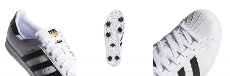 슈퍼스타의 트레이드 마크인 조개 모양의 러버 쉘토를 필두로 하여 어퍼와 힐컵, 아웃솔 밑면에는 트레포일 로고를 넣었고 사이드에는 골드컬러의 ‘슈퍼스타(SUPERSTAR)’ 레터링으로 클래식한 멋을 살렸다.