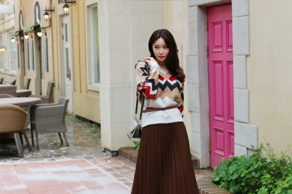 비하인드 컷에서 청하는 배색과 스팽글 장식이 돋보이는 브이넥 니트와 플리츠 스커트 착장에 허리 벨트 장식으로 컨템포러리한 데일리 룩을 선보였다.