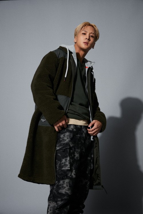 화보 속 라비가 착용한 ‘리버시블 우븐패치 플리스’를 활용한 트렌디한 밀리터리 룩을 완성했다. 카무플라주 패턴과 함께 양면으로 입을 수 있는 리버시블 플리스에 그레이 컬러 조거 팬츠와 매치해 편안하지만 스타일리시한 분위기를 연출했다.
