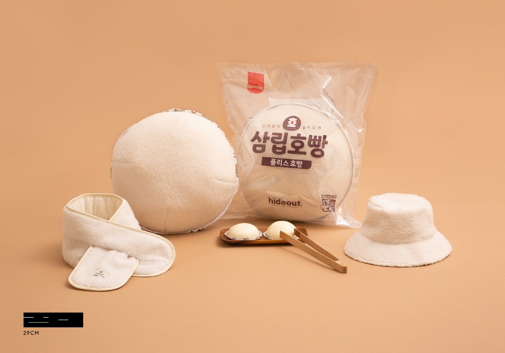 플리스 호빵 쿠션은 쿠션, 머플러, 버킷햇으로 이루어진 방한 3종 세트로 삼립호빵의 대표 상품인 단팥 호빵의 외관을 똑같이 묘사한 것이 특징이다. 플리스 소재를 통해 호빵 특유의 따스함이 느껴지도록 디자인한 것은 물론 호빵 바닥에 종이까지 원단으로 재연하여 재미까지 더했다. 플리스 호빵 쿠션은 포장지까지도 삼립호빵 패키지와 동일한 디자인으로 기획했다. 컬러는 물론, 텍스트의 폰트까지도 세심하게 살폈다. 내용 또한 영양성분을 패러디 하여 플리스의 장점을 나열하는 등 유머 요소까지 갖췄다. 가격은 54800.