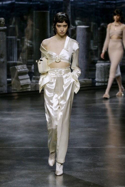 워시드 밍크(washed mink)와 본디드 스웨이드 코트(bonded suede coat)의 벨 슬리브, 오피스 룩에서 자주 볼 수 있는 핀 스트라이프 패턴을 활용한 실크 셔츠, 완벽한 비율이 돋보이는 울 테일러링 등 컬렉션의 다양한 아이템들은 ‘펜디’ 가문의 다섯 자매가 선보여온 패션 스타일에서 영감을 받았다.