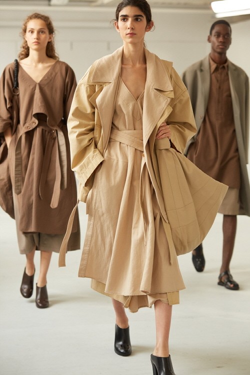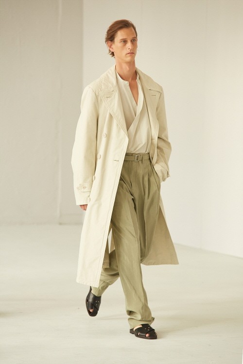 프랑스 어드밴스드 컨템포러리 브랜드 ‘르메르’는 시그니처 아이템으로 절제되고 은은한 디자인의 트렌치 코트를 내세우고 있다. 올 봄에는 편안한 움직임을 위한 여유 있는 핏을 강조했으며 오묘한 컬러를 활용한 톤온톤 스타일링을 선보였다. 아이보리/그레이 중간인 특색 있는 펠리컨 그레이 컬러의 롱 트렌치 코트를 화이트 셔츠, 카키 오버사이즈 팬츠와 매치해 편안하면서 시크한 파리지앵 룩을 제안했다. 또 두 벌의 트렌치를 겹쳐 입은 듯한 느낌을 주는 베이지 블루종에 동일한 색상의 브이넥 셔츠 드레스, 큼직한 숄더백을 조합한 스타일링도 인상적이다.