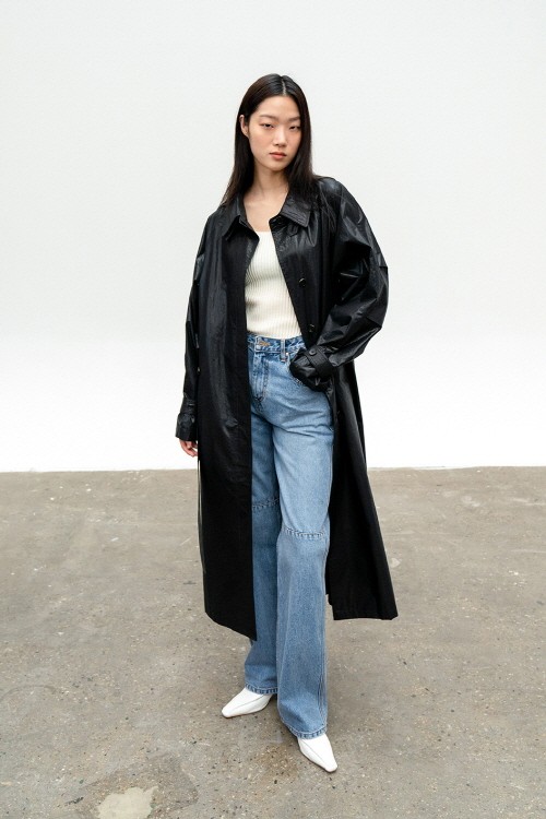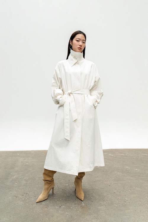 특히 광택이 도는 매끄러운 표면과 더블 칼라의 래글런 트렌치 코트는 자연스러운 오버사이즈 피트에 스탠드와 셔츠 카라의 2가지 방식으로 활용할 수 있는 카라 디테일이 매력적이다. 여기에 유연하게 흐르는 소매 라인의 비죠 장식과 허리 부분의 벨트를 활용해 자신만의 방식으로 차별화된 스타일을 연출 하기도 좋다.