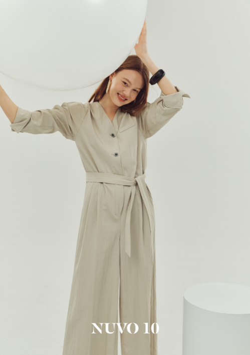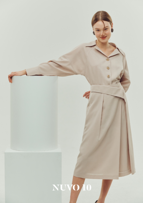 누보텐의 시그니처 아이템인 셔츠형 롱 원피스, 셔츠형 블라우스와 스커트 조합, 점프 수트는 부드러운 곡선과 언밸런스한 디테일로 새롭게 업데이트가 되었다.
