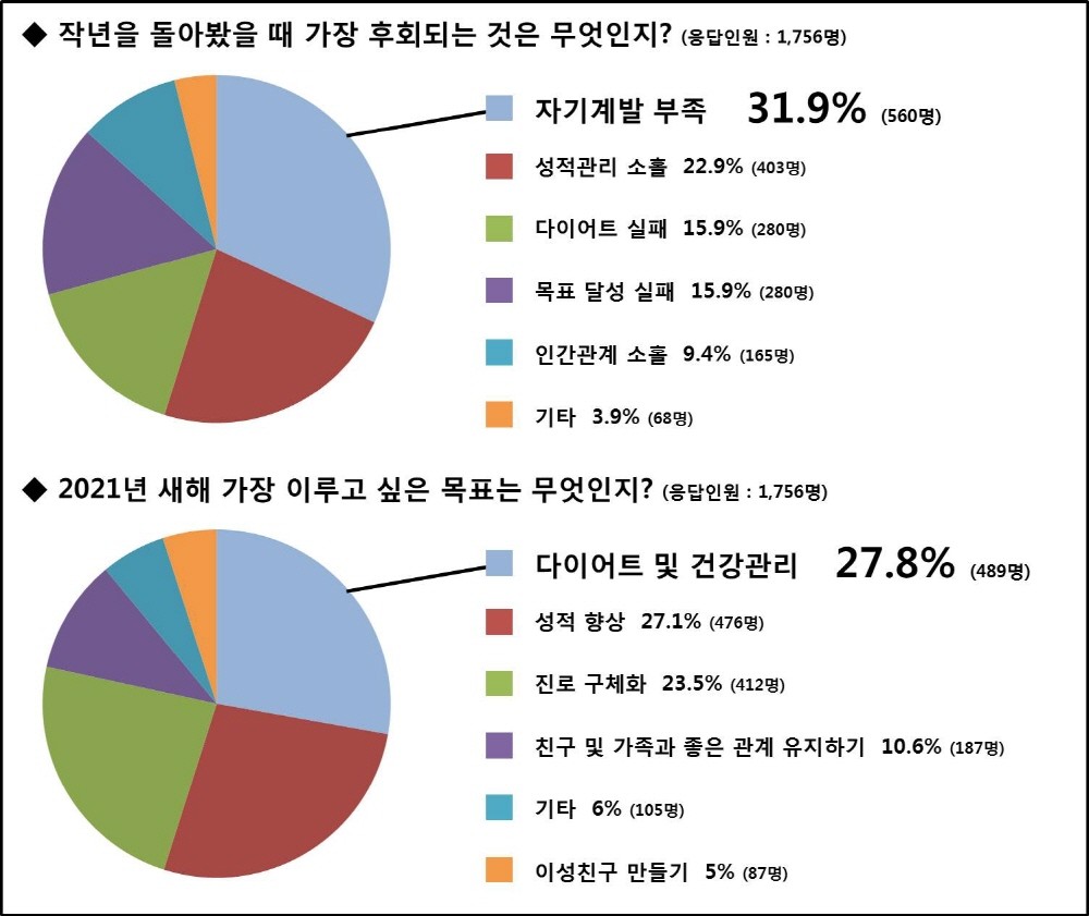 ‘작년을 돌아봤을 때 가장 후회되는 것은 무엇인지’에 대한 질문에는 ▲자기계발 부족(31.9%, 560명), ▲성적관리 소홀(22.9%, 403명), ▲다이어트 실패(15.9%, 280명), ▲목표 달성 실패(15.9%, 280명), ▲인간관계 소홀(9.4%, 165명), ▲기타(3.9%, 68명)라고 응답했다.