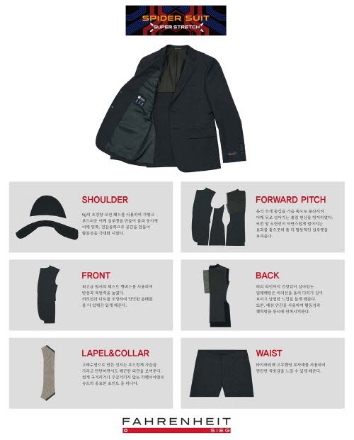 스파이더 수트는 탄성과 복원력이 뛰어난 투 웨이 라이크라 스트레치 소재로 만들어졌으며 관절 및 근육의 편안한 움직임을 극대화한 패턴 및 부자재를 적용해 언제 어디서나 편안한 착용감과 활동성을 제공하는 기능성 수트다.