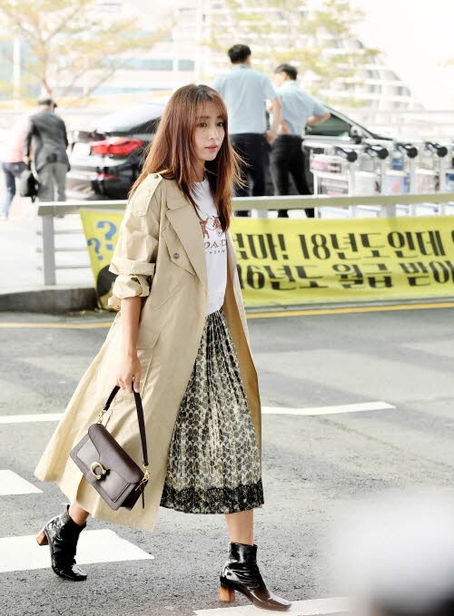 트렌치코트에 플리츠 스커트, 그리고 토트백을 매치해 세련된 공항패션을 선보인 그녀는 인천국제공항을 단번에 런웨이로 만들어 시선을 더욱 집중시켰다.