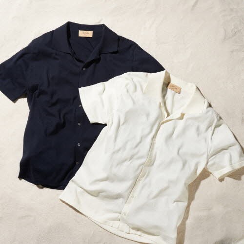 오픈 칼라 하프 니트 셔츠는 셔츠 디자인으로 전체적으로 흐르는 듯한 실루엣이 특징이다. 소재는 이태리 코튼 스페셜리스트 회사인 MTB사에서 공급받은 최상급의 마코 코튼 소재로 제작되어 한층 부드러운 텍스처와 함께 고급스러운 느낌을 준다. 또한 우수한 통기성과 흡습성으로 여름철 무더운 날씨에도 쾌적한 착용감을 선사한다.