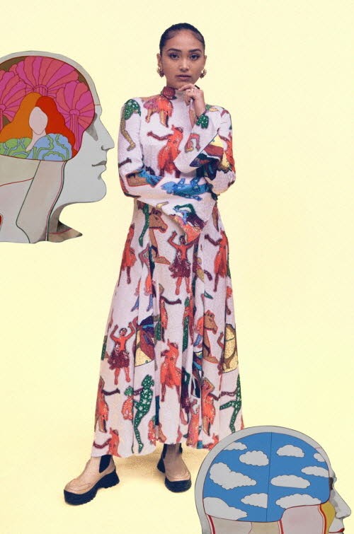 비틀즈의 대표곡 ‘루시 인 더 스카이 위드 다이아몬드(Lucy in the Sky with Diamonds)’의 장면에서 영감을 받아 댄서의 모습을 패치워크 방식으로 표현한 블라우스, 원피스는 화사하면서 동시에 우아하고 여성스러운 매력을 선사한다.