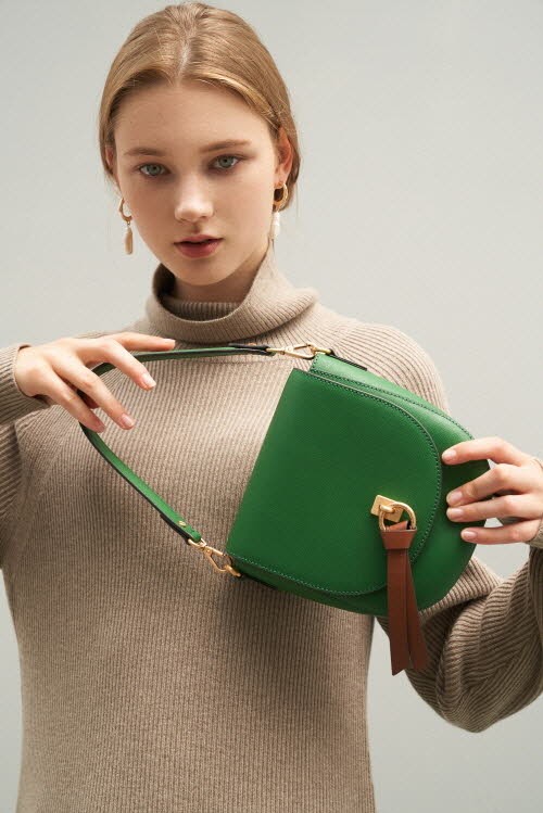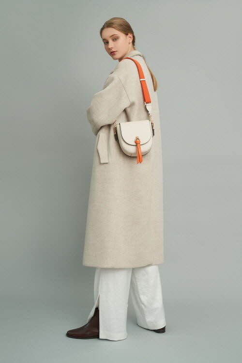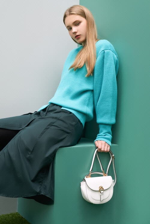 볼륨감 있는 라운드 쉐입의 새들백은 온라인몰에서 단독으로 공개하는 제품으로 플랩의 매듭 장식과 웨빙 스트랩의 경쾌한 컬러 매치가 감각적인 데일리백이다.